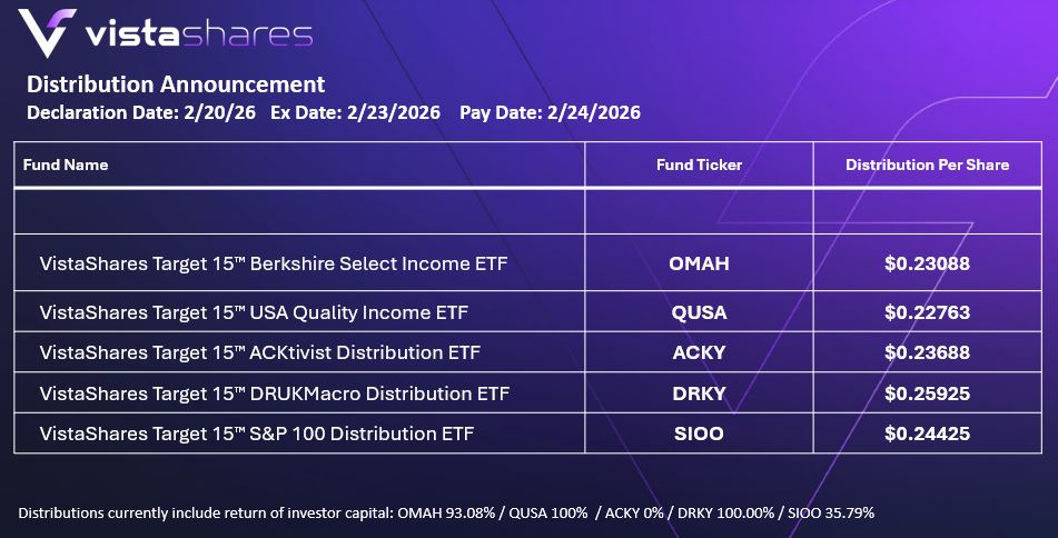 VistaShares, an innovative asset manager seeking to disrupt the status quo in thematic exposures, income investing, and more, is today announcing the distribution amounts for its five Target 15™ ETFs: VistaShares Target 15 S&P 100 Distribution ETF, VistaShares Target 15 DRUKMacro Distribution ETF (DRKY), VistaShares Target 15 ACKtivist Distribution ETF (ACKY), VistaShares Target 15™ Berkshire Select Income ETF (OMAH), and VistaShares Target 15 USA Quality Income ETF (QUSA).
