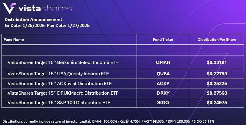 VistaShares, an innovative asset manager seeking to disrupt the status quo in thematic exposures, income investing, and more, is today announcing the distribution amounts for its five Target 15™ ETFs: VistaShares Target 15 S&P 100 Distribution ETF, VistaShares Target 15 DRUKMacro Distribution ETF (DRKY), VistaShares Target 15 ACKtivist Distribution ETF (ACKY), VistaShares Target 15™ Berkshire Select Income ETF (OMAH), and VistaShares Target 15 USA Quality Income ETF (QUSA).