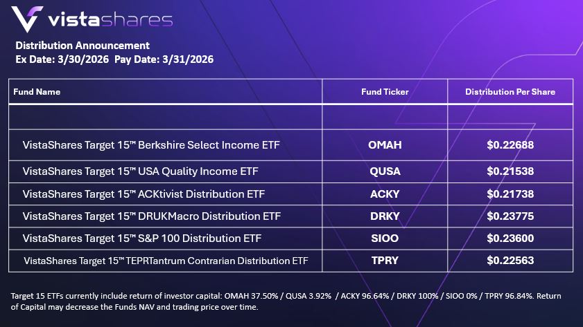 VistaShares, an innovative asset manager seeking to disrupt the status quo in thematic exposures, income investing, and more, is today announcing the distribution amounts for its six Target 15™ ETFs: VistaShares Target 15™ TEPRTantrum Contrarian Distribution ETF (TPRY), VistaShares Target 15 S&P 100 Distribution ETF, VistaShares Target 15 DRUKMacro Distribution ETF (DRKY), VistaShares Target 15 ACKtivist Distribution ETF (ACKY), VistaShares Target 15™ Berkshire Select Income ETF (OMAH), and VistaShares Target 15 USA Quality Income ETF (QUSA).