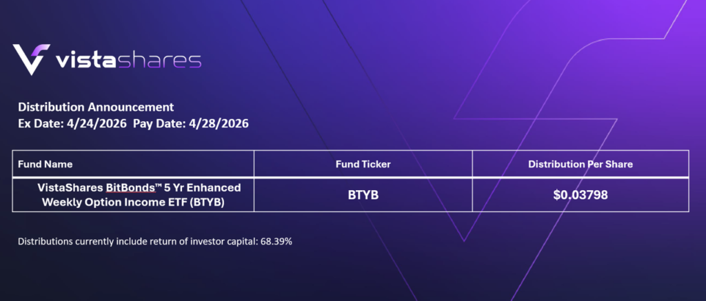April 24, 2026 Declaration Date – NEW YORK & SAN FRANCISCO & BOSTON – VistaShares, an innovative asset manager seeking to disrupt the status quo in thematic exposures, income investing, and more, is today announcing the next weekly distribution amounts for its new fund, BitBonds™ 5 Yr Enhanced Weekly Option Income ETF (BTYB).